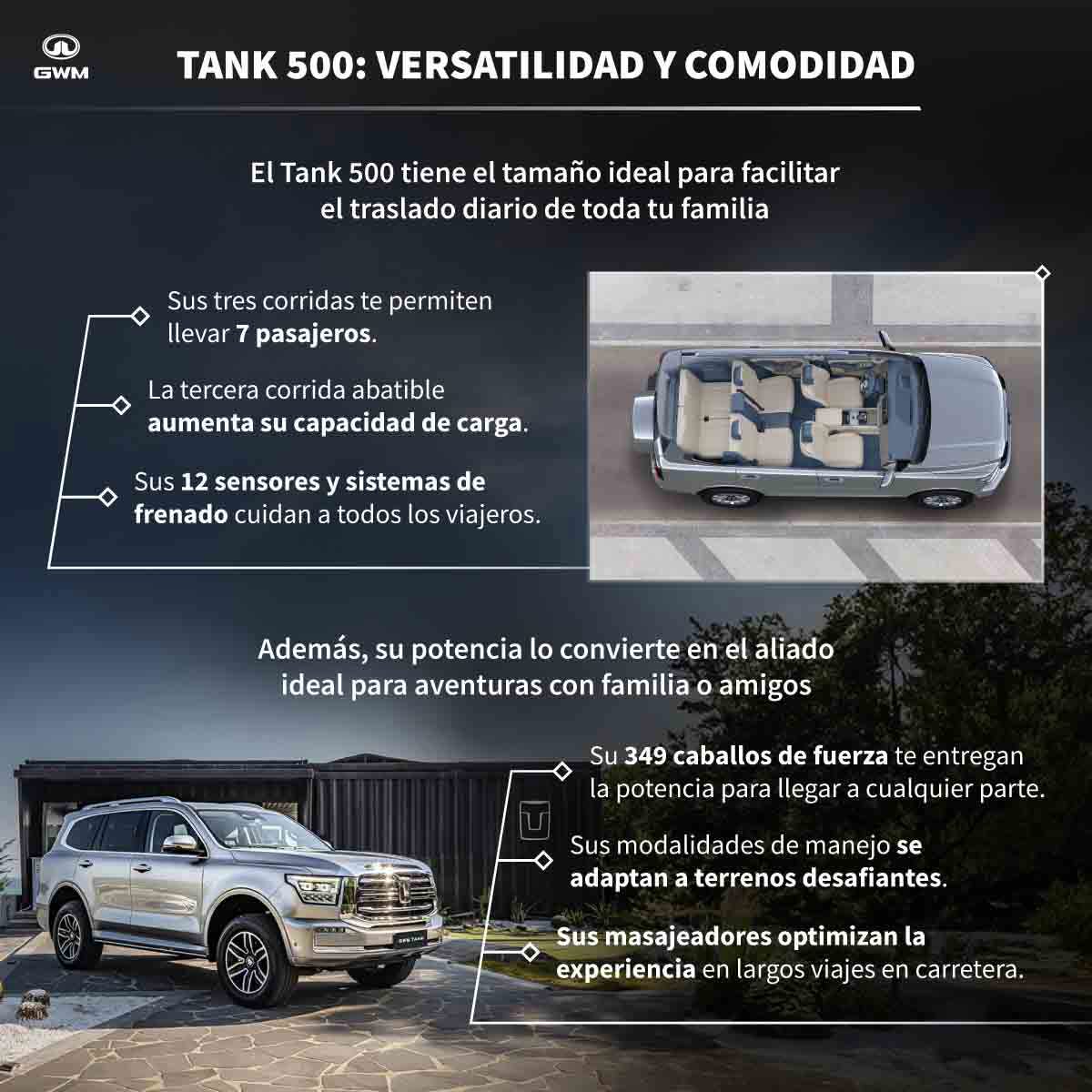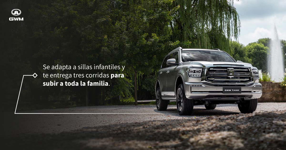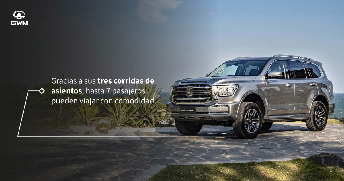 Si quieres llevar la experiencia de estos autos a otro nivel, el Tank 500 te entregará la dosis perfecta de potencia, espacio y tecnología. Este SUV 7 pasajeros es ideal para cualquier salida, tanto para dejar a tus hijos en su colegio como para meterse en terrenos complicados con tus amigos.