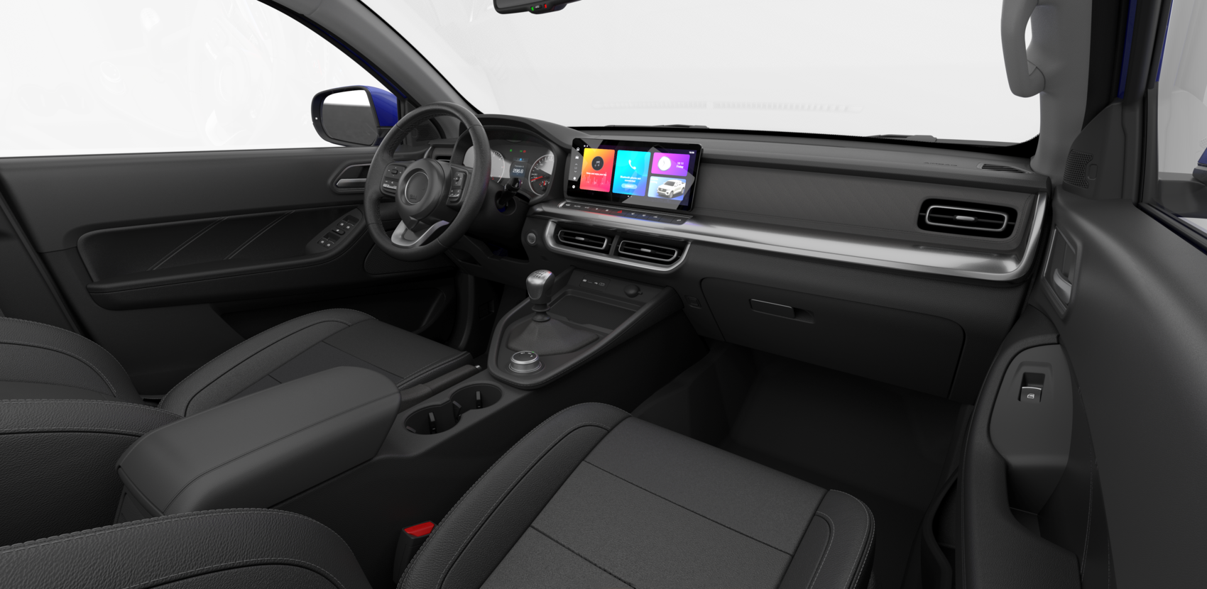 Los asientos de ecocuero de alta calidad en la camioneta de carga POER aportan elegancia a tu conducción, destacando el compromiso con el estilo, la sofisticación y el confort.